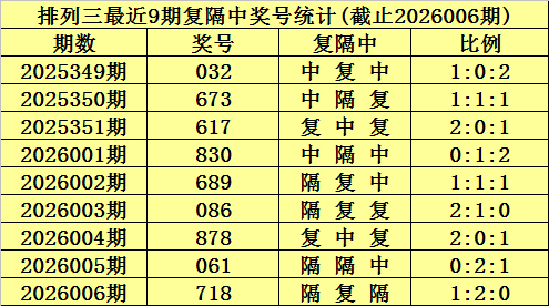 上期转头:陈列三第2026006期奖号为:718。大小比为2:1,奇偶比为2:1,012路比为0:2:1。