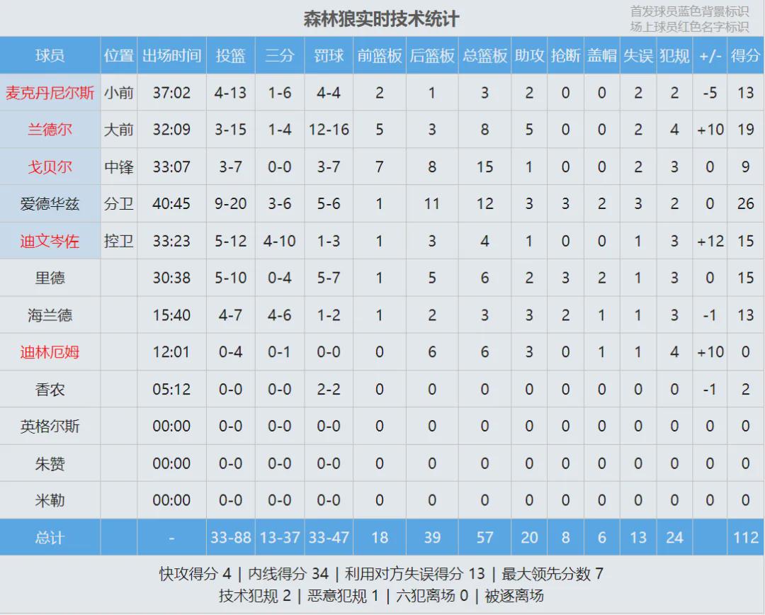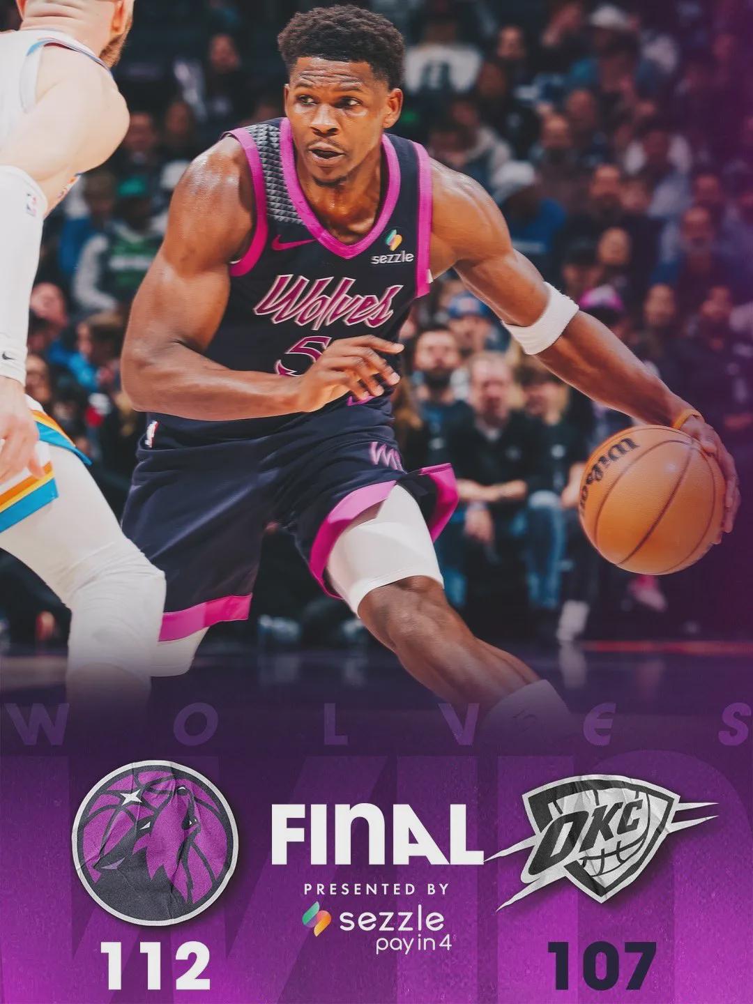 全场达成,丛林狼112-107力克雷霆,干掉定约第一!爱德华兹26分12板3助3断2帽、兰德尔19分8板5助!芬奇6分钟自爆,丛林狼最终罚球数47-30比雷霆多了17个。亚历山大空砍35分5板7助2断2帽、杰伦-威廉姆斯17分7板。