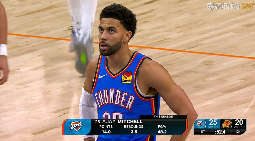 布克中投射中,杰伦威三分也中,雷霆这一波三分雨得回6分特出。