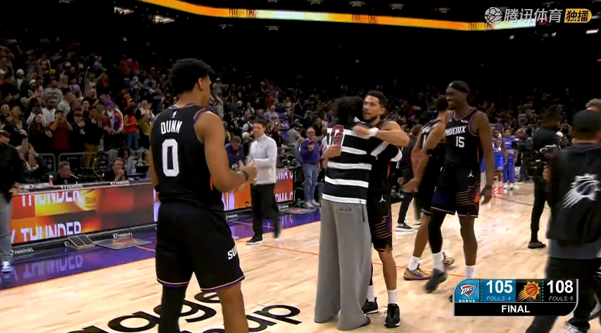 比赛范畴,太阳球员在场上心情庆祝获胜,杰伦格林也显得极为振奋,走入场内,一把抱住布克庆祝。