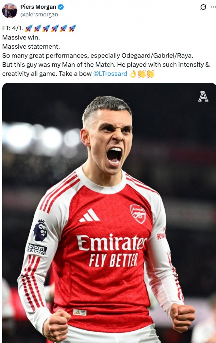 阿森纳拥趸摩根赛后也在社媒推敲谈:“终场比分4-1!关键的奏效,紧迫的宣言。本场比赛多东谈主的出色阐明中,厄德高、加布里埃尔和拉亚尤为凸起。但我的全场最好球员是特罗萨德,他整场比赛王人充满了心思与创造力。向特罗萨德请安。”