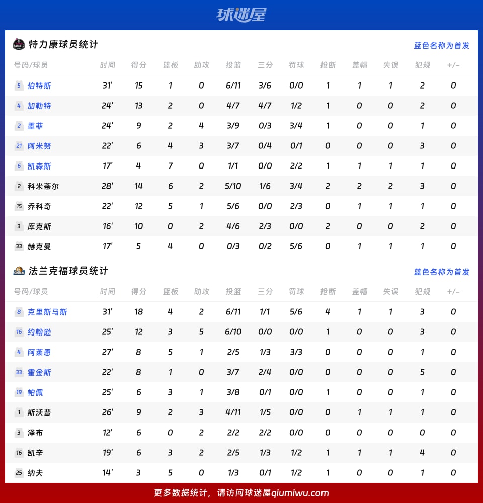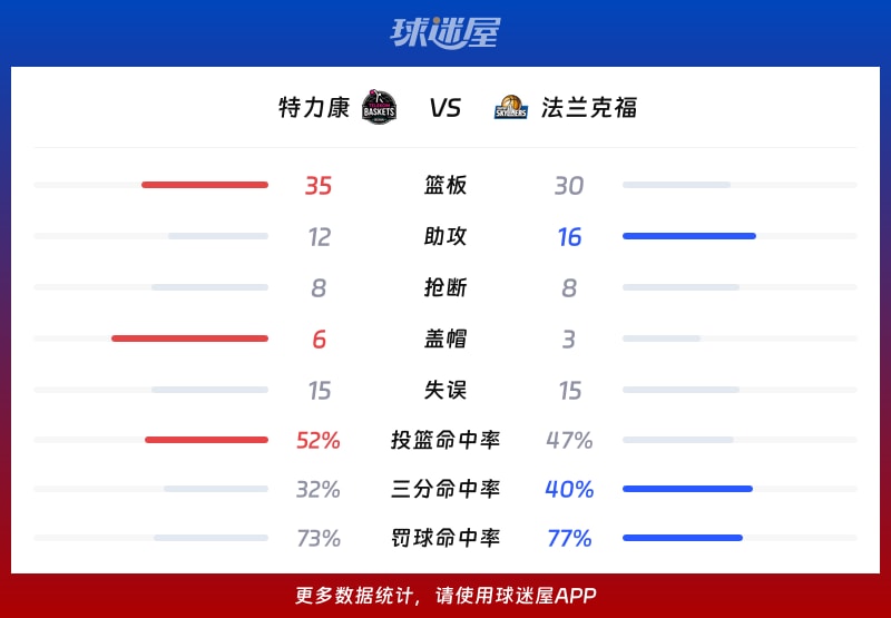 特力康vs法兰克福:得分88-76、篮板35-30、助攻12-16、抢断8-8、盖帽6-3、诞妄15-15、投篮掷中率52%-47%、三分掷中率32%-40%、罚球掷中率73%-77%