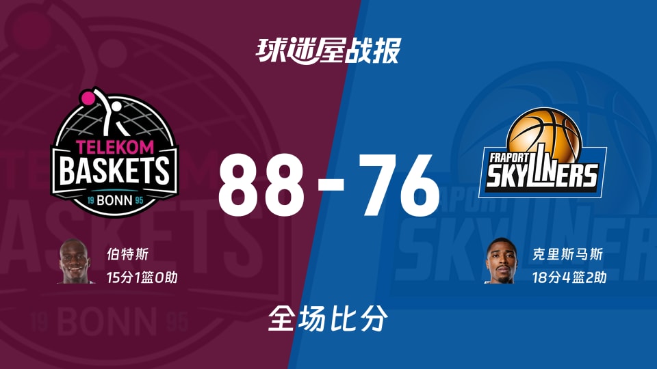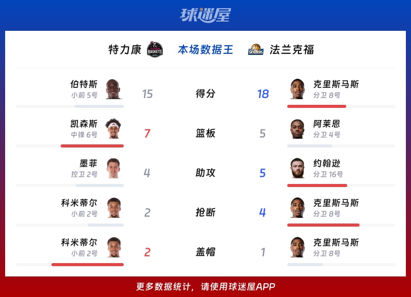 法兰克福:克里斯马斯18分、约翰逊12分、阿莱恩8分、霍金斯8分、帕佩6分