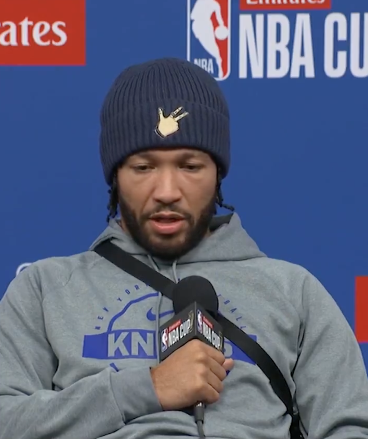 尼克斯球员杰伦-布伦森接纳了记者采访。