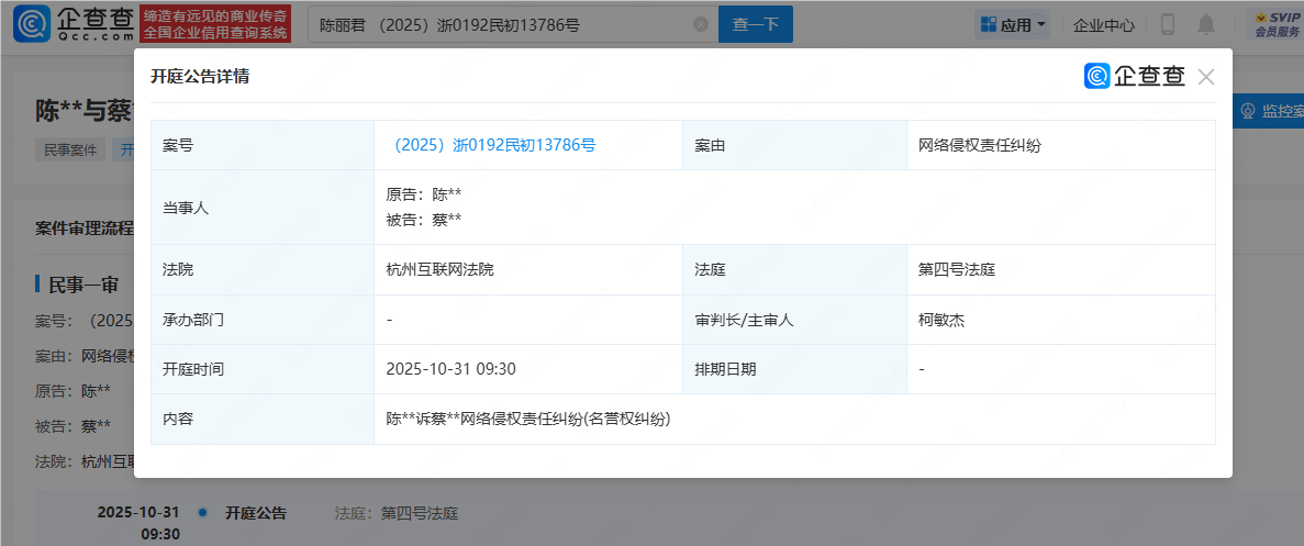 企查查APP露馅,近日,法院公开陈丽君告状蔡某某案件信息。据悉,该案波及汇注侵权背负纠纷(名誉权纠纷),瞎想将于10月31日在杭州互联网法院开庭审理。