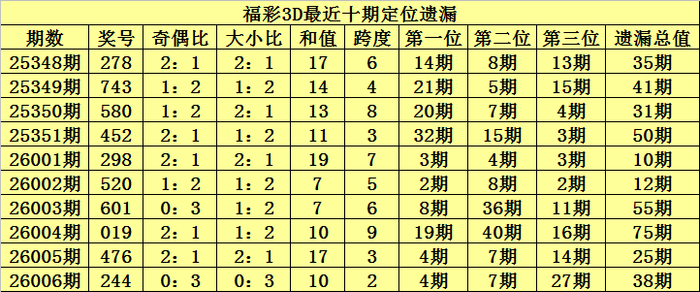 开奖总结:福彩3D第2026006期奖号:244,百位号码遗漏4期、十位号码遗漏7期、个位号码遗漏27期,遗漏总值为38期。