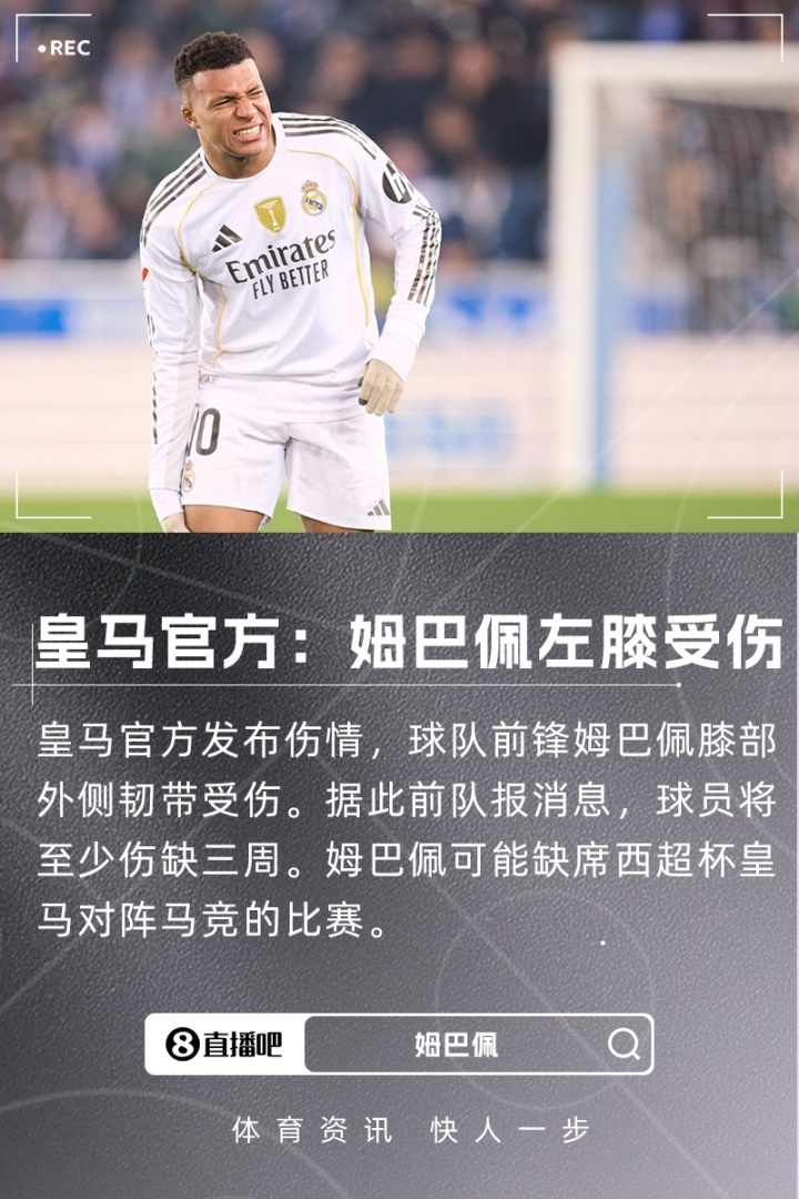 01月03日讯 2025年12月31日,皇马官方文书姆巴佩际遇左膝扭伤,据报说念称姆巴佩将因此至少缺战三周,此前他还是带伤出战多场比赛,在年末终末一场比赛中追平了C罗的皇骑兵史单当然年进球记录。