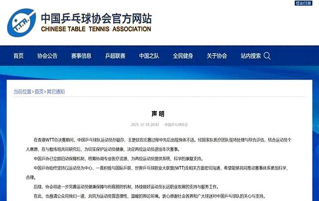 事件的风光是清亮的:在WTT香港总决赛上,国乒的两位中枢主力,孙颖莎与王楚钦,史无先例地先后退赛。